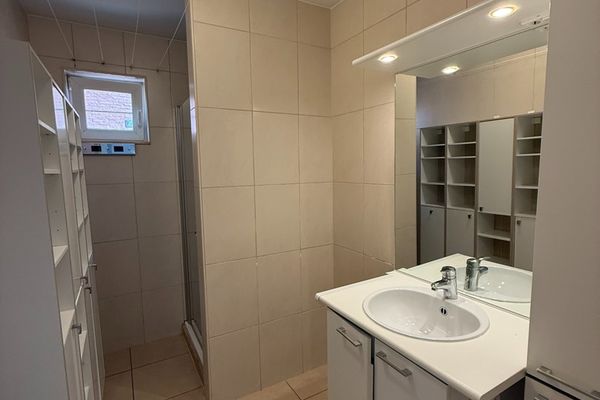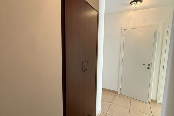 Inkomhal - 2x slaapkamers - badkamer met douche + wastafelmeubel - berging/wasplaats - apart toilet - ruimte woonkamer met open volledig geïnstalleerde keuken en toegang naar het terras.