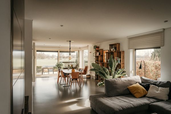 De woon- en eetkamer vormen één open geheel en genieten van een maximale lichtinval en een uniek uitzicht op het groen.